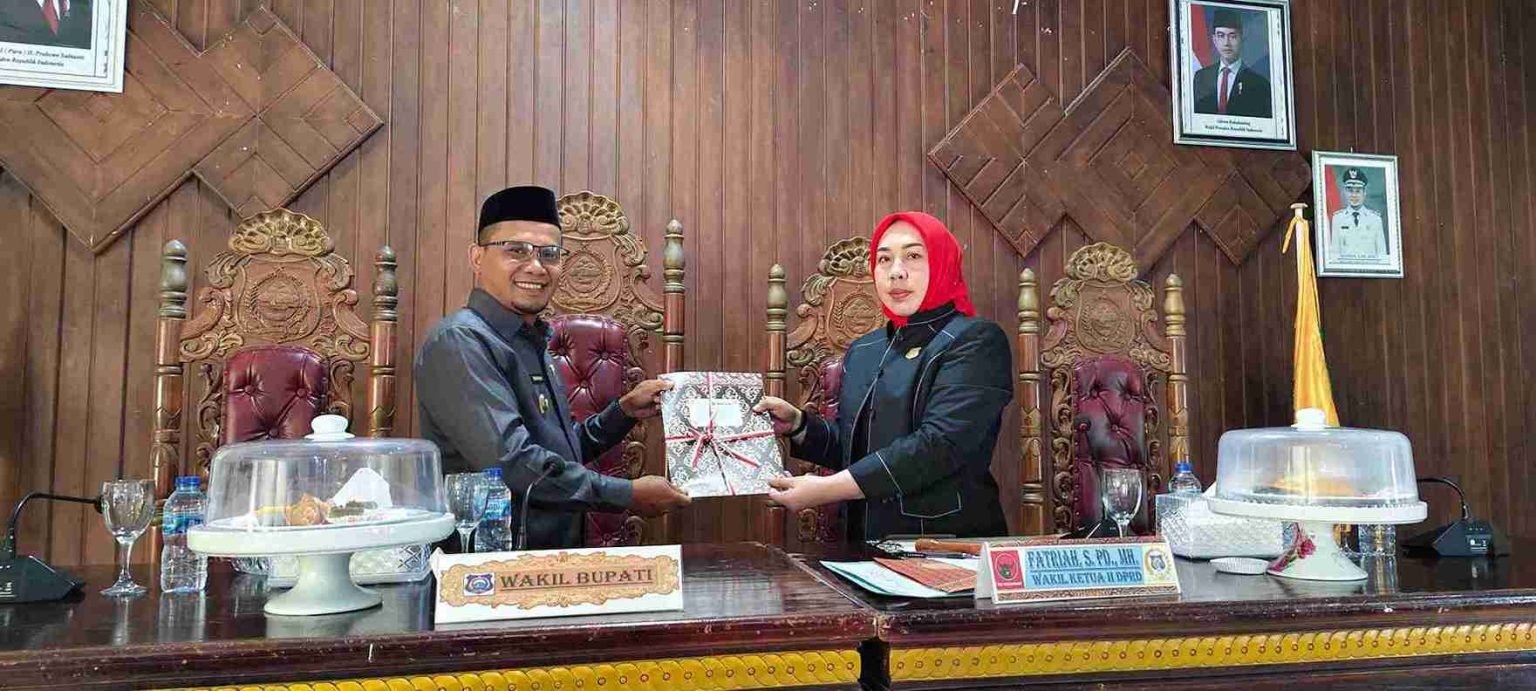 Wakil Ketua II DPRD Butur, Fatriah serahkan rekomendasi DPRD terhadap LKPJ Bupati Tahun Anggaran 2025 ke Wakil Bupati Butur, Rahman.